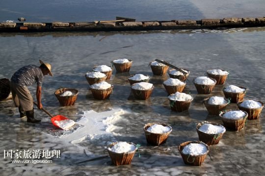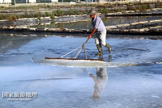 國家旅游地理 浙江臺(tái)州8月10日訊 8月10日,在浙江溫嶺市石塘鎮(zhèn)蒼岙鹽場(chǎng),一名鹽工頂著太陽在鹽田里把曬好的鹽收集起來挑到鹽堆去。連日來,浙江省溫嶺市石塘鎮(zhèn)蒼岙鹽場(chǎng)的鹽工利用晴熱天氣忙著曬鹽。對(duì)于浙江的曬鹽人來說,夏季陽光最猛烈的7月、8月、9月這三個(gè)月是他們勞作的黃金季節(jié)。天氣越炎熱,光照越猛烈,曬鹽效果就越好。炎熱的夏天艷陽高照,而曬鹽人卻要頂著高溫出門勞作。 /新華社發(fā)(梁敏慧 攝)
