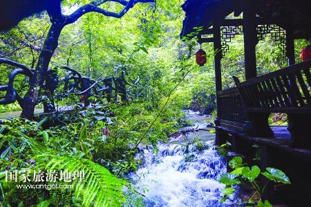 穿過(guò)客家小鎮(zhèn)古色古香的街道,卻走進(jìn)了一片清幽的圣地——圣人谷。圣人谷由盤龍寨和盤鳳寨相互盤踞而成,古藤老樹環(huán)繞中,陽(yáng)光被遮擋得支離破碎,斑斑點(diǎn)點(diǎn)地灑落在雀躍的溪流上、濕潤(rùn)的石徑中。這里是靜寂的,沒(méi)有絲毫凡間世俗;這里又是熱鬧的,蟲鳴鳥叫、泉水叮咚、古樹摩挲,各種大自然的聲響充斥在耳邊。時(shí)而,小路旁會(huì)有木質(zhì)小樓梯,把人引入一間草寮,在竹制的桌椅旁,傾聽(tīng)著大自然的交響樂(lè),生活的各種紛擾霎那間煙消云散。