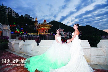 乘著電瓶車,從客天下廣場(chǎng)穿過(guò)雅致的圣山湖住宅區(qū),赫然出現(xiàn)在眼前的卻是大型婚禮殿堂,純歐式的建筑群隱匿在青山綠水中:乳白色的圓形屋頂、七彩斑斕的玻璃窗、富麗堂皇的大吊燈,見(jiàn)證了一對(duì)又一對(duì)新人走進(jìn)幸福的殿堂。在充滿異域風(fēng)情的幸福里大街,蘇格蘭風(fēng)笛表演、皇家馬車、中世紀(jì)格調(diào)的咖啡館,一幕又一幕,讓人恍若時(shí)空交錯(cuò)。